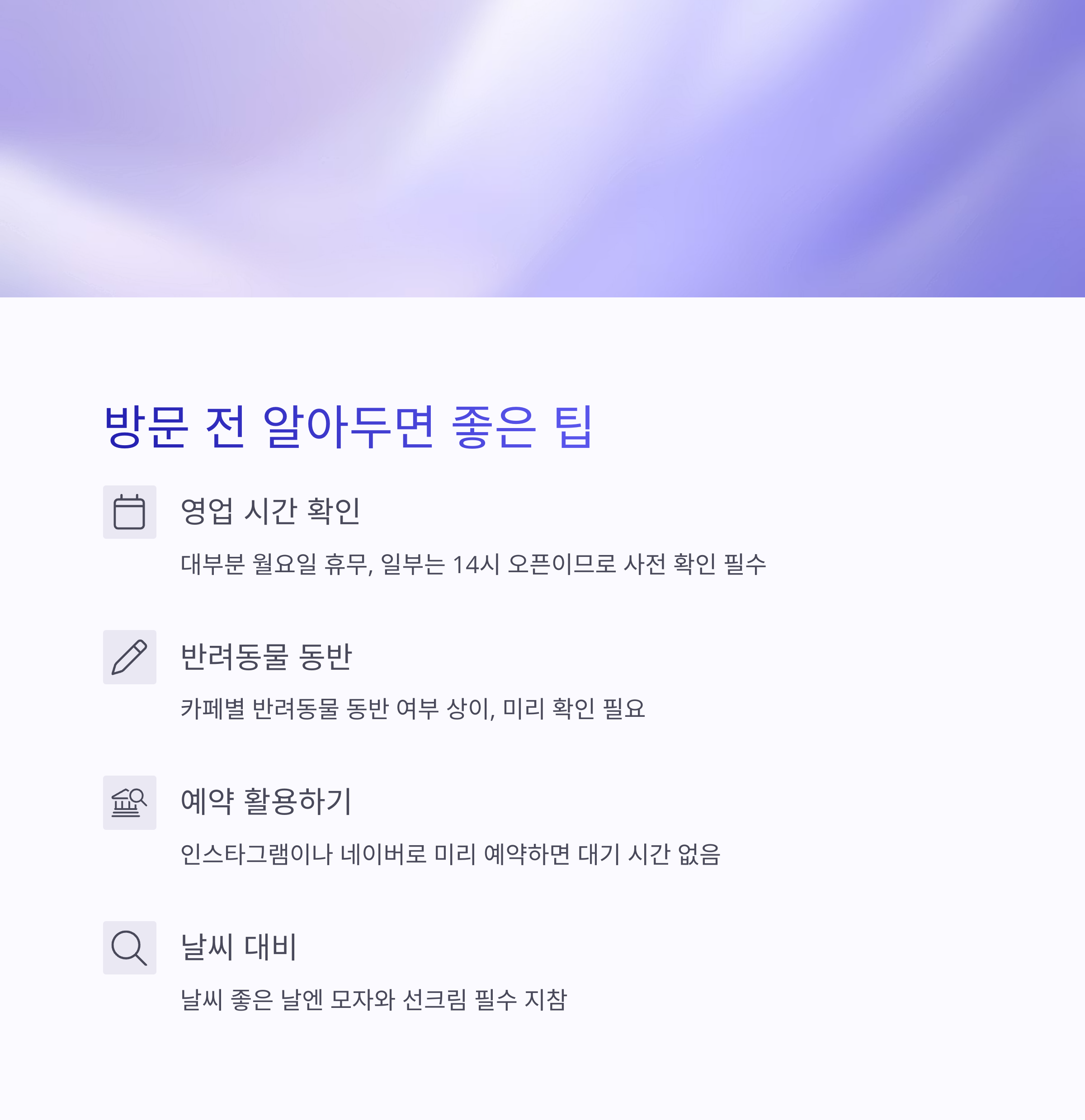 - 대부분의 카페는 월요일 휴무 혹은 14시 오픈인 곳이 있으므로 사전 확인 필수