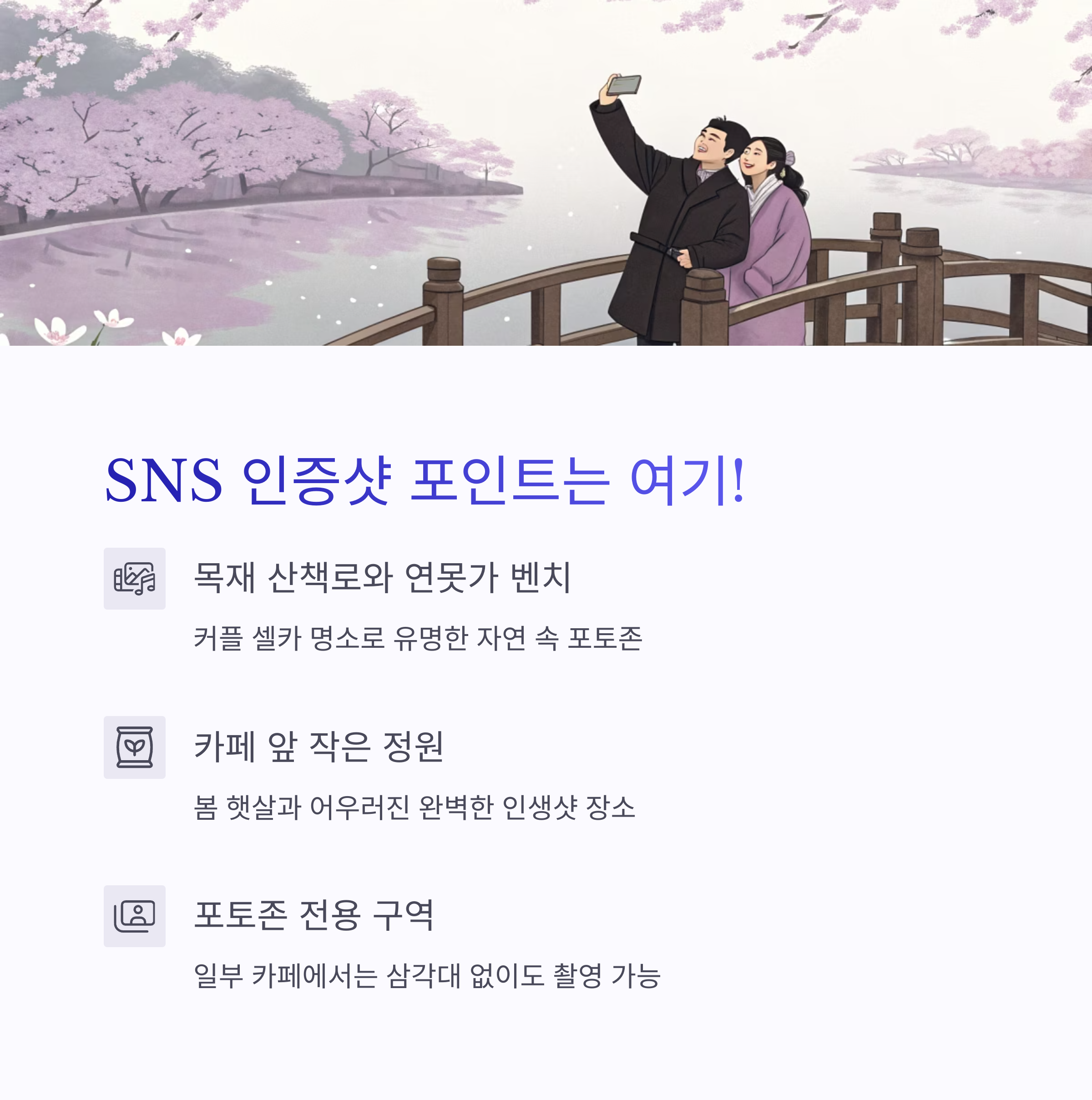 특히 목재 산책로와 연못가 벤치, 카페 앞 작은 정원은 커플 셀카 명소로 유명합니다.