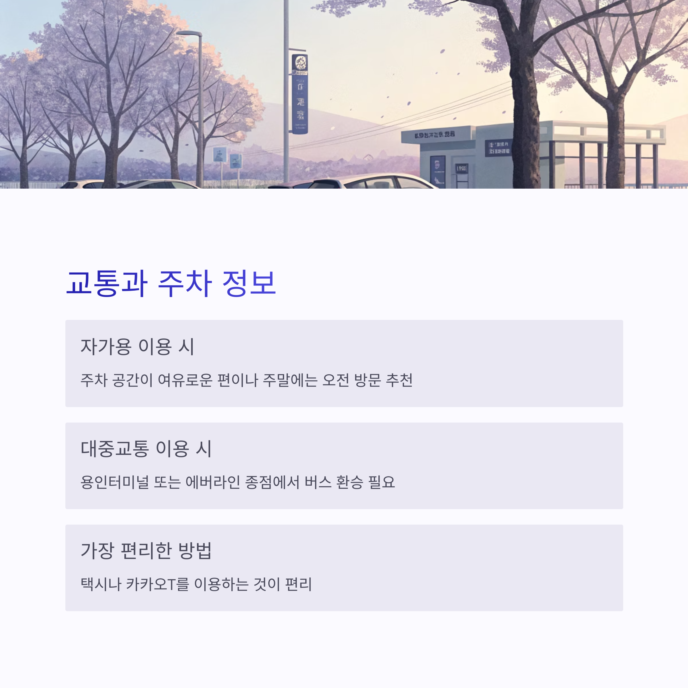 대중교통 이용 시 용인터미널 또는 에버라인 종점에서 버스를 갈아타야 하며,