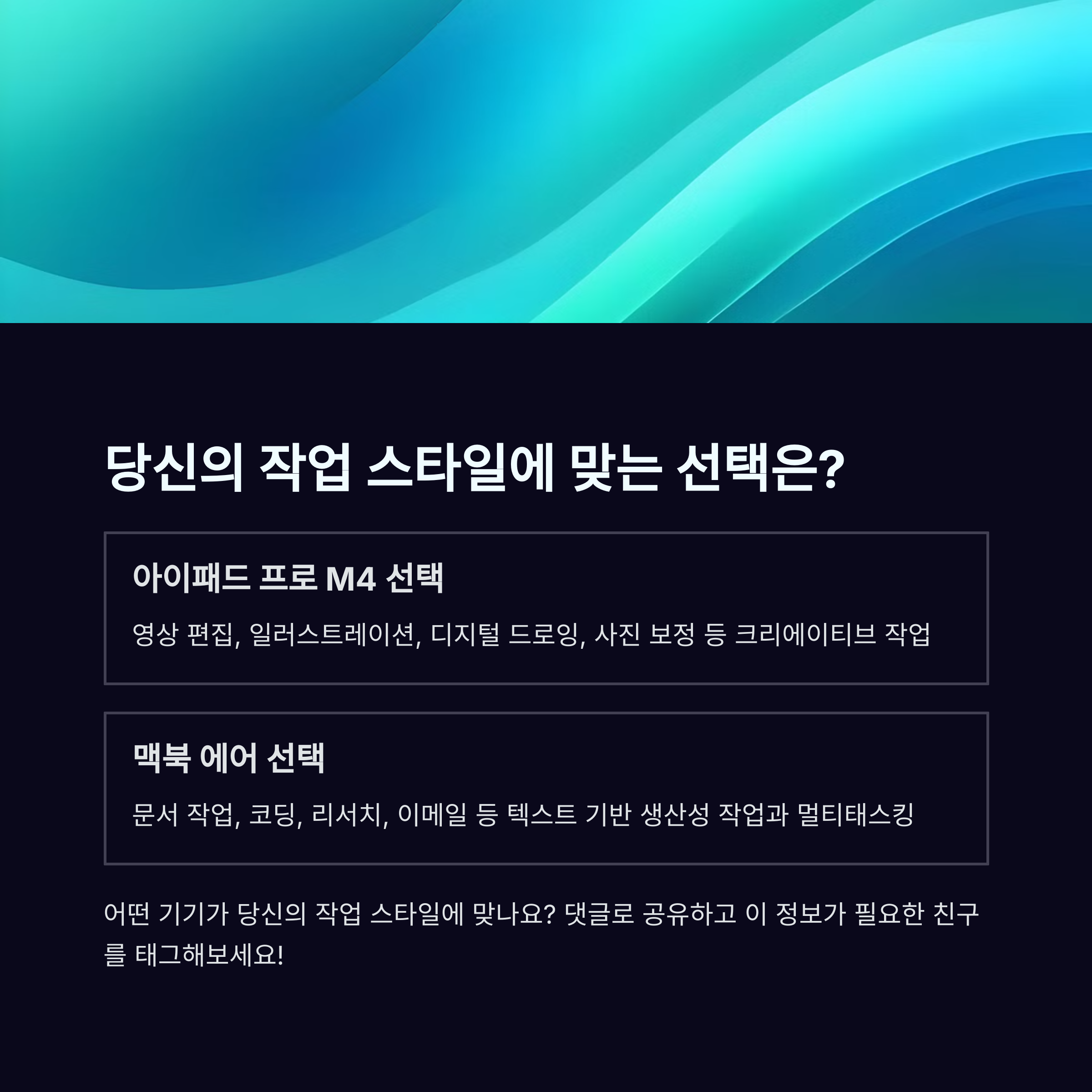 지금까지 아이패드 프로 M4와 맥북 에어 M2의 콘텐츠 작업 성능을 비교해봤어요. 각자 장단점이 분명하고, 어떤 도구가 ‘더 낫다’라기보단 어떤 사람이 어떤 상황에서 사용하는지가 더 중요하단 걸 다시금 느꼈습니다. 저처럼 매일 다양한 콘텐츠를 다루는 분들이라면, 이 두 기기를 모두 고려해보고 자신의 스타일에 맞는 조합을 찾는 게 최선일 수 있어요. 혹시 이 글을 읽고도 아직 고민 중이시라면, 댓글로 작업 스타일이나 용도를 남겨주세요. 제가 경험 바탕으로 추천드릴게요! 😉