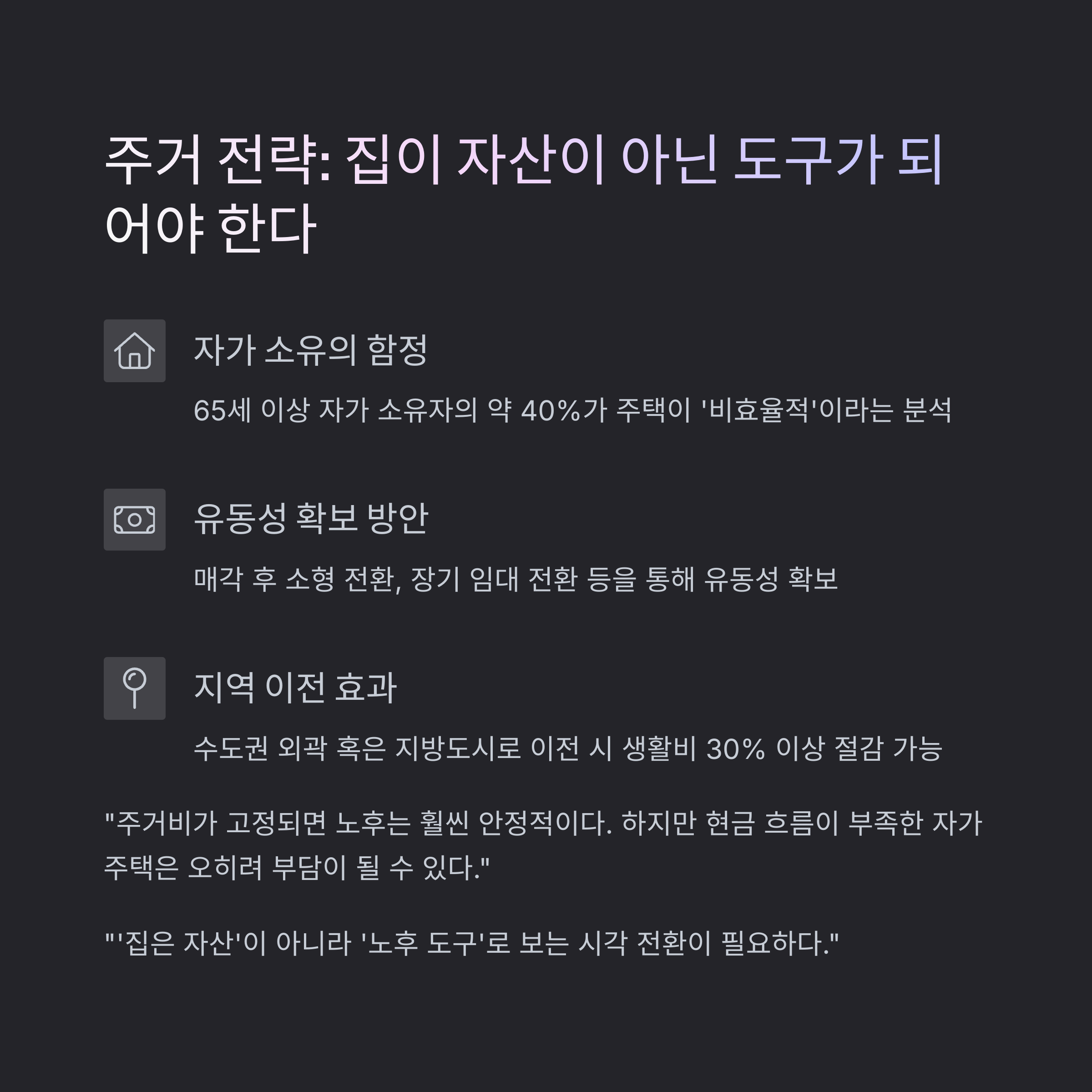 전문가들은 소형화, 주택연금, 지방 이전 등 주거 전략 다변화를 조언합니다.