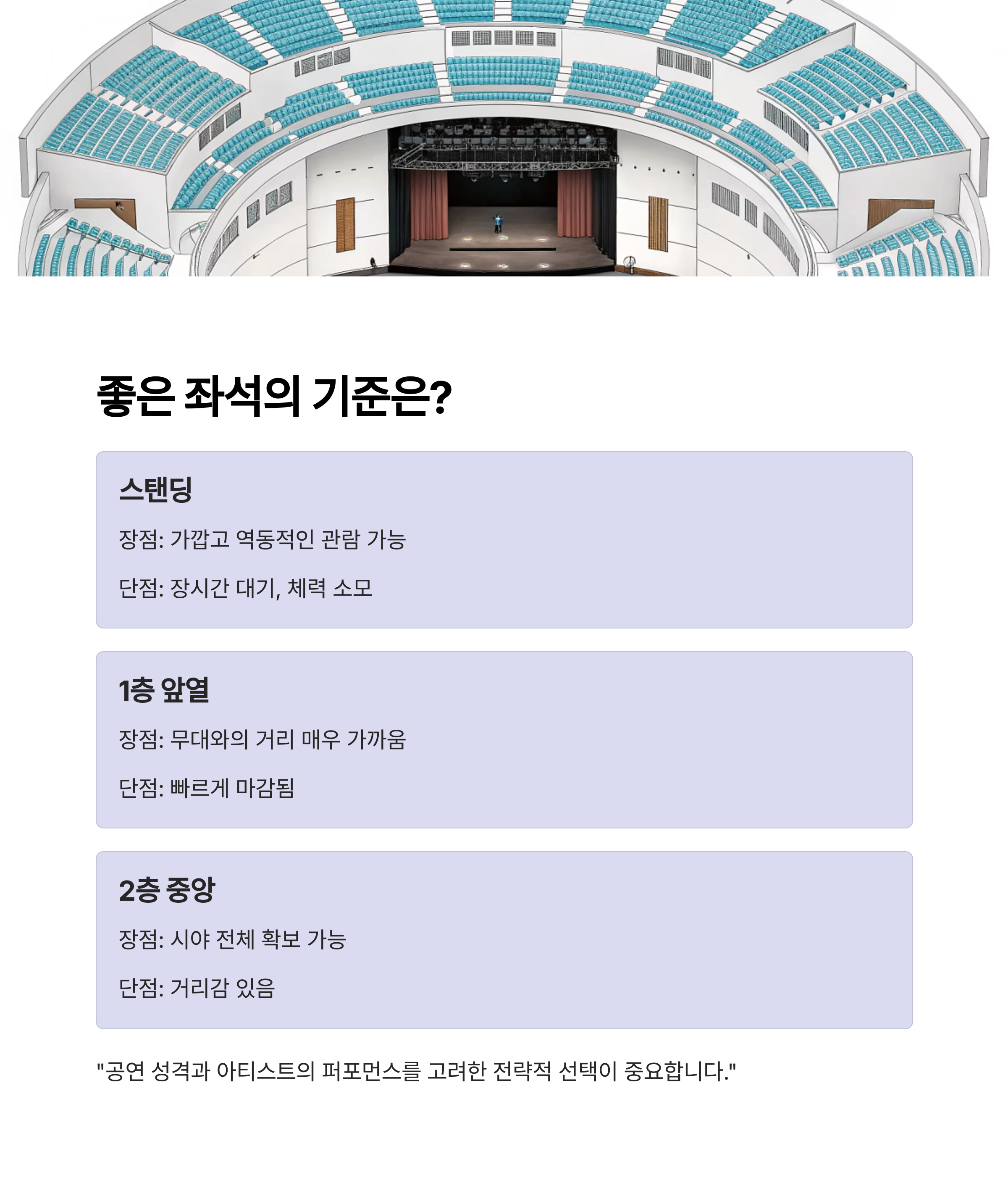 | 스탠딩 | 가깝고 역동적인 관람 가능 | 장시간 대기, 체력 소모 |