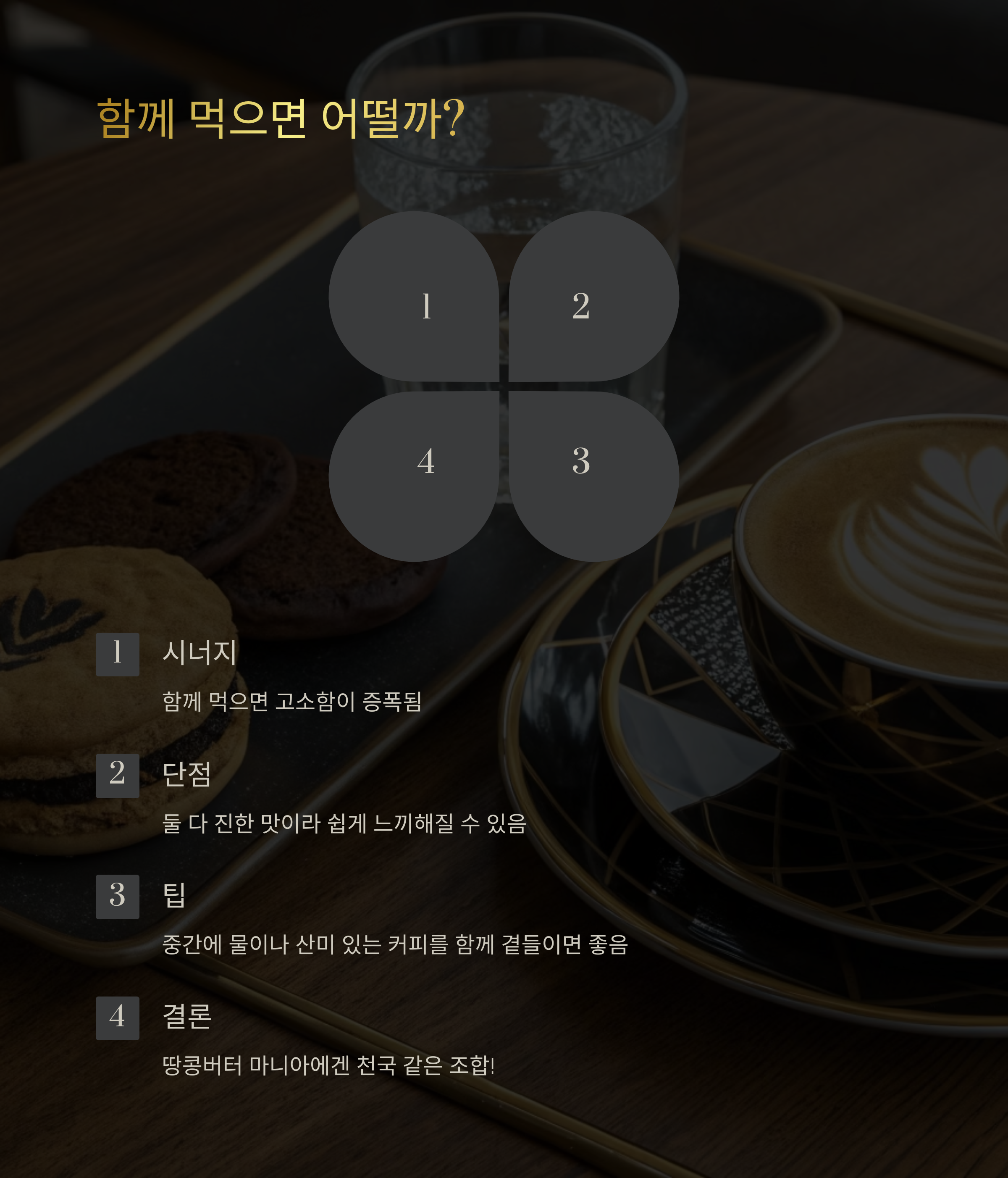 중간에 물이나 산미 있는 커피를 함께 곁들이면 더 좋습니다.