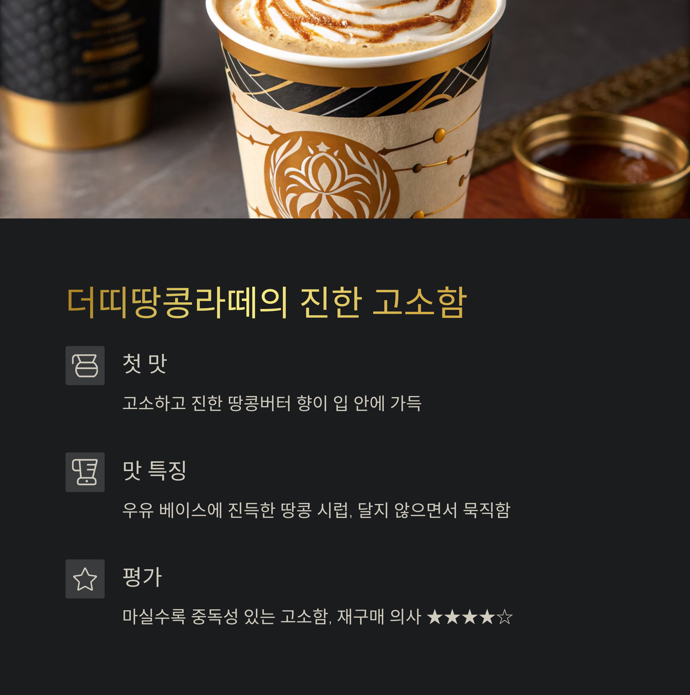 더띠땅콩라떼는 은은한 단맛과 고소함이 오래 남아 재구매 의사 있음.