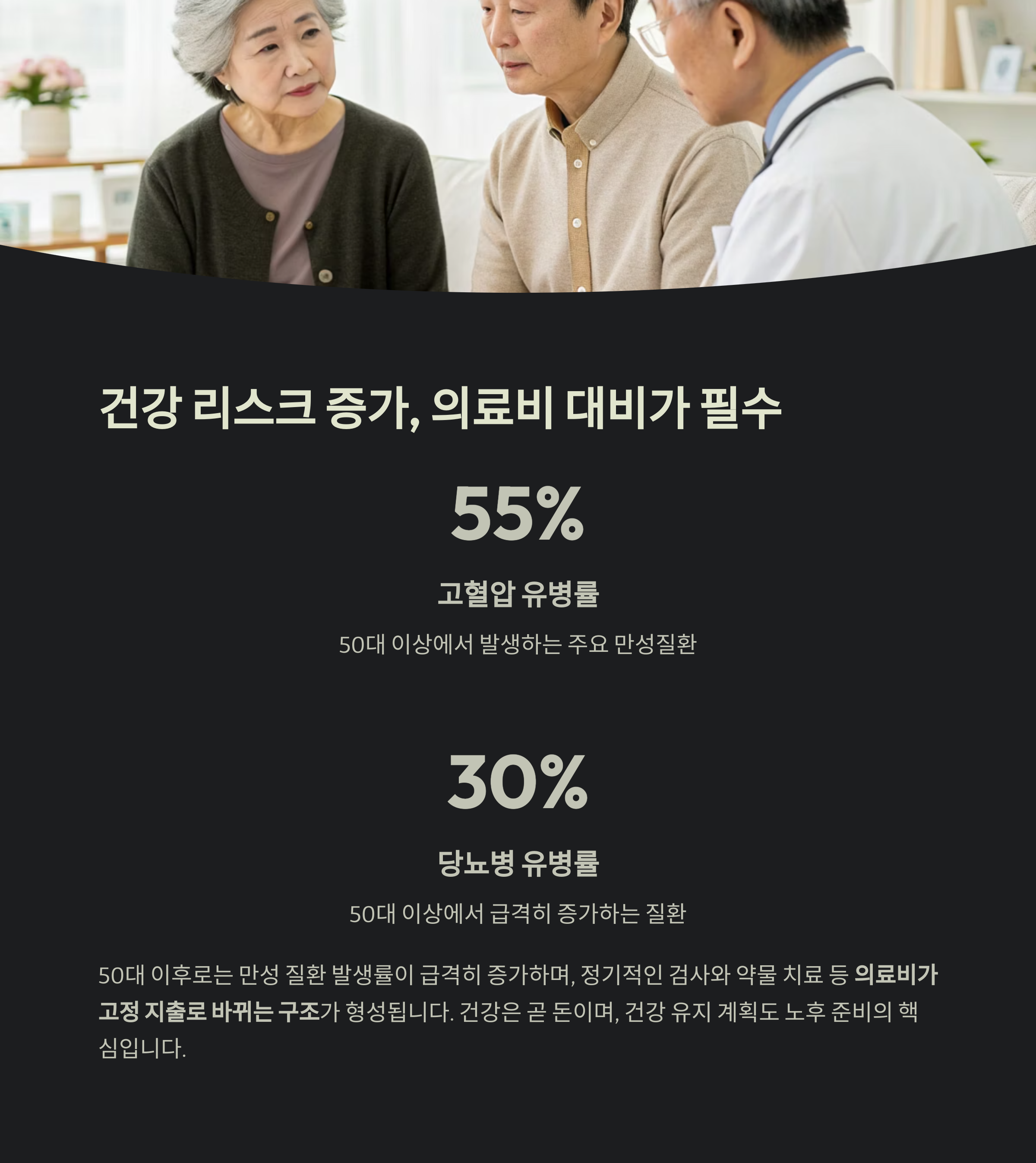 50대 이후로는 만성 질환 발생률이 급격히 증가합니다.