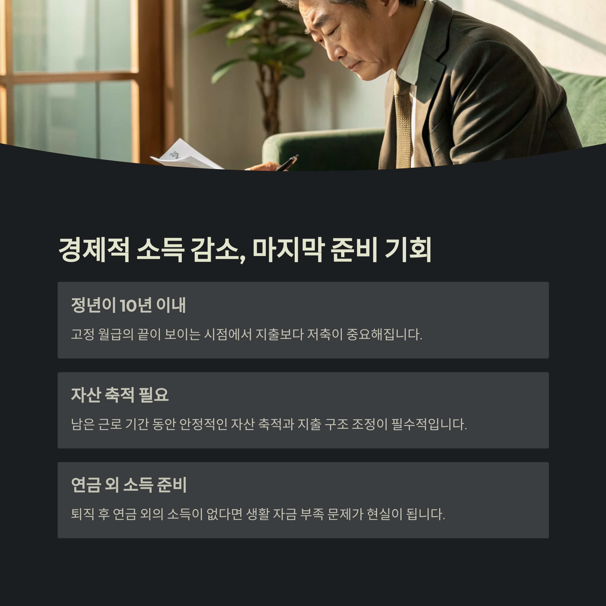 | 경제적 기반 | 소득 감소 대비 자산 축적 필요 |