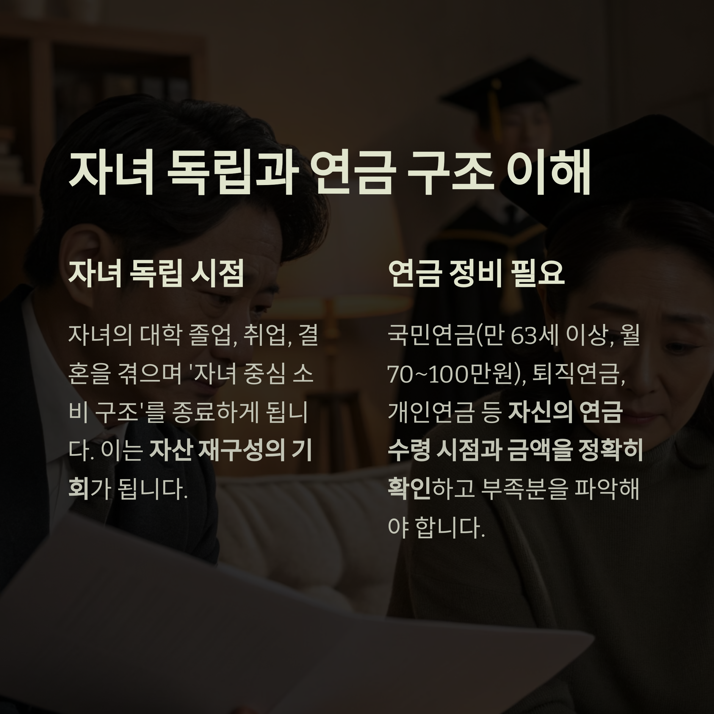 자녀 독립은 소비 감소로 이어져 자산 재구성의 기회가 됩니다.
