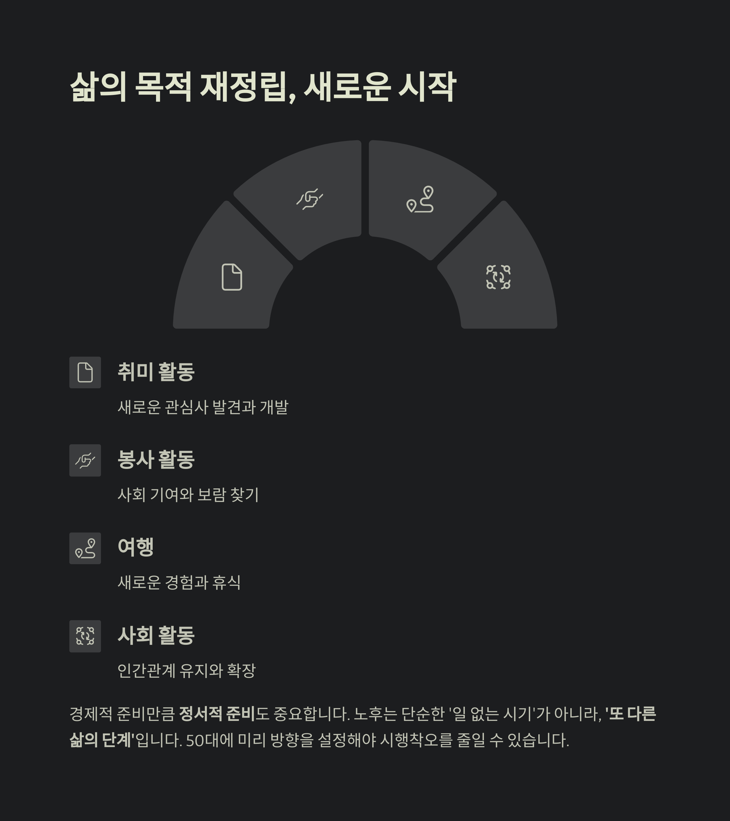 취미, 봉사, 여행, 사회활동 등 삶의 질을 좌우할 방향을 설정해야 하며