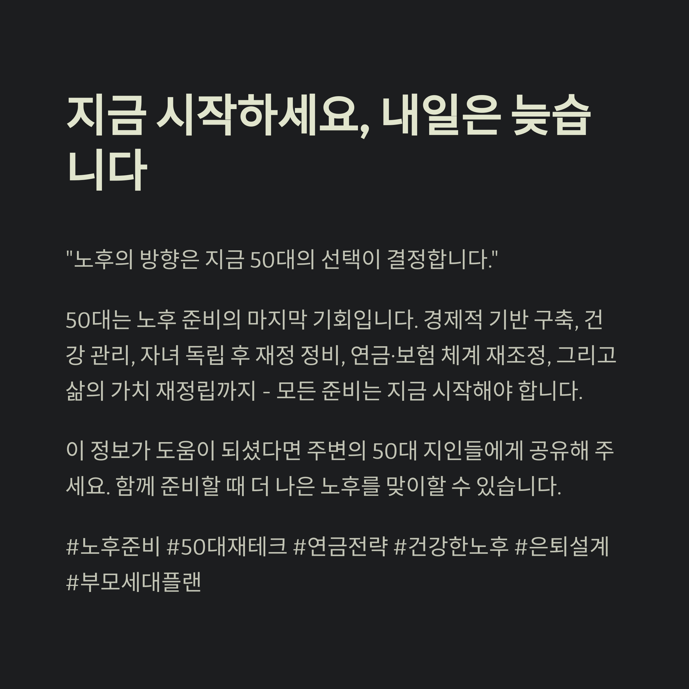 지금 준비하지 않으면, 나중엔 시간이 없습니다. 50대는 노후 준비의 마지막 기회입니다. 지금이 바로 시작할 때입니다.